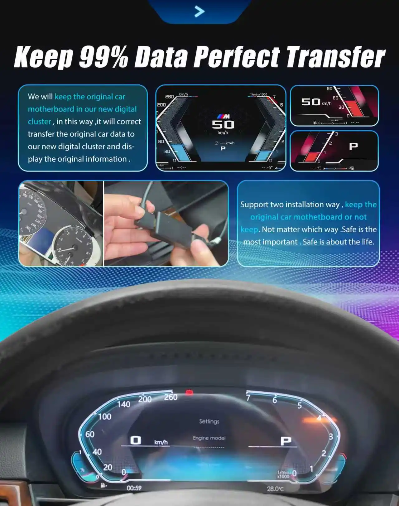 2. we keep the original car motherboard ,mean keep the head , we do transfer original car information and display in the new digital cluster , all is ISO cable . plug in and play .